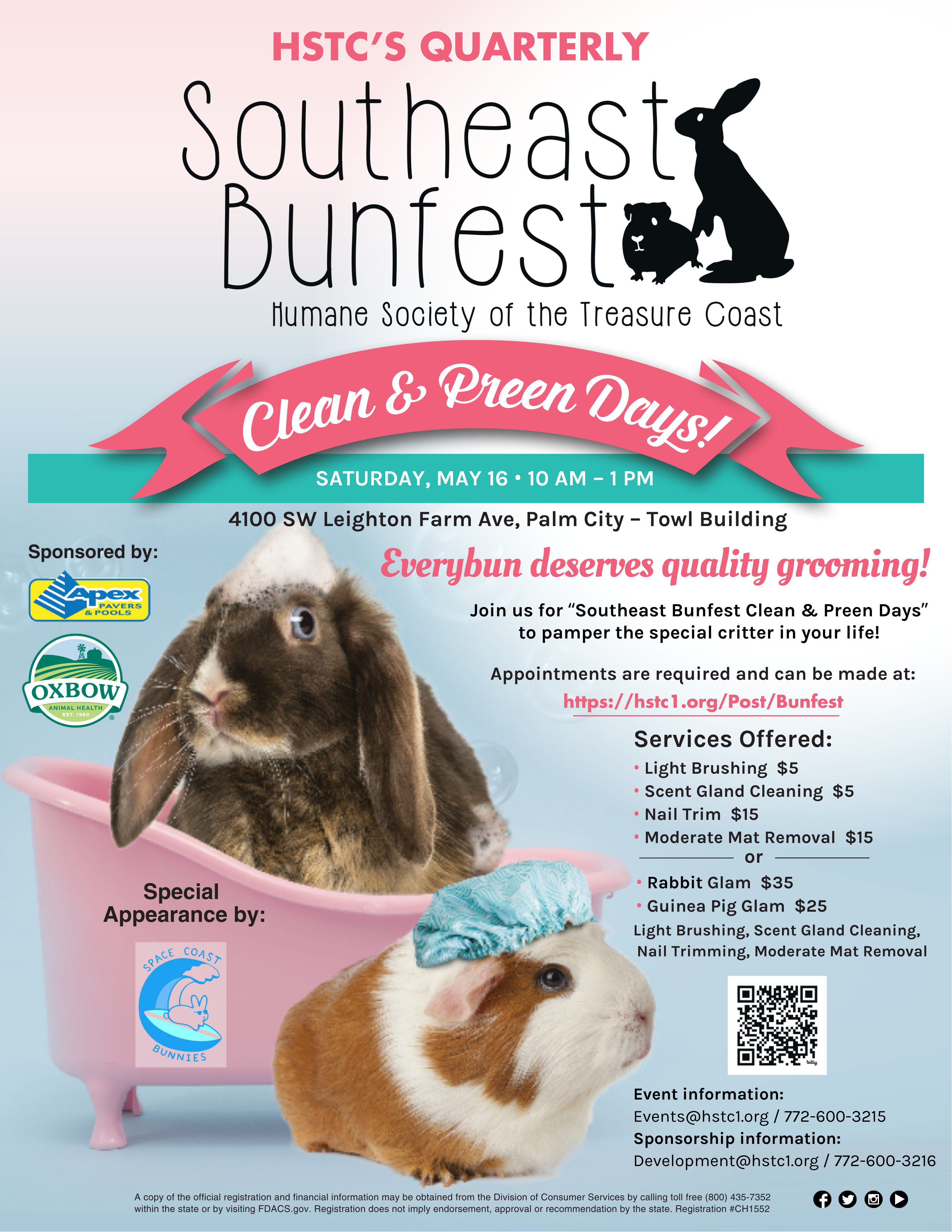 Everybun deserves quality grooming! Southeast Bunfest Clean & Preen Days pamper the special critter in your life! Your rabbit or guinea pig will leave feeling fluffy and fresh with a nail trim, light brushing, scent gland cleaning and moderate mat removal. Appointments are required! Please arrive 15 minutes before your appointment for mite check. All critters will be checked for mites prior to being groomed. If mites are found, we will credit you for the next Southeast Bunfest Clean & Preen Day to allow time for treatment. Refunds will not be issued.